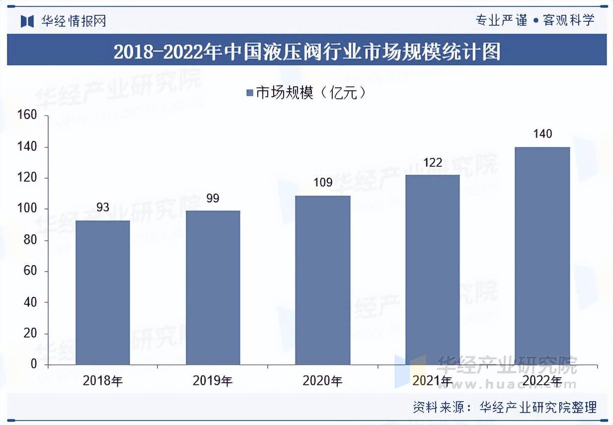 我国液压阀技术起步较晚,伴随着工业与技术的发展,液压阀已广泛应用于工程机械、矿山机械、机床、冶金、农业机械、港口机械、石油化工、航天工业等行业。从市场地域分布来看,全球液压闻市场主要被德国、美国、日本等国家的产品所占据。近年来,我国液压阀市场规模快速发展,2018年我国液压阀市场规模为93亿元,2022年增至140亿元,复合增长率达10.77%。